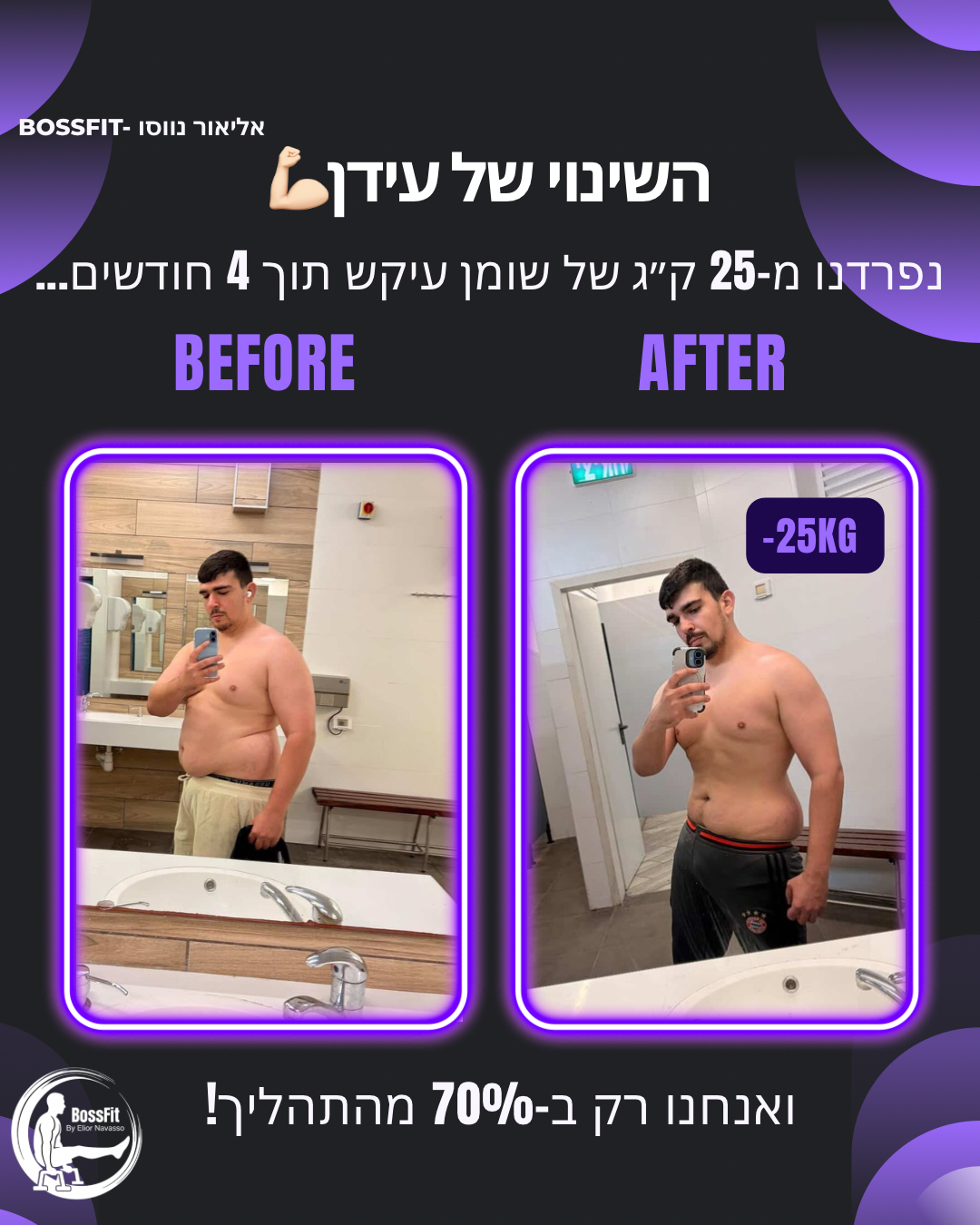 אני מתמחה בליווי מתאמנים בכל הרמות והתאמת תהליך מדויק למטרות האישיות שלהם. דרך בניית תפריט מותאם אישית, תכנית אימונים ייחודית וזמינות מלאה 24/7 כך שאין מצב שלא תתמיד ותגיע לתוצאות בהתחייבות.